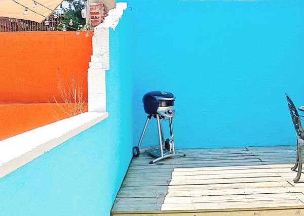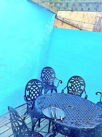 OUTDOOR SPACE: Private turquoise painted patio with furniture included.