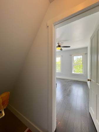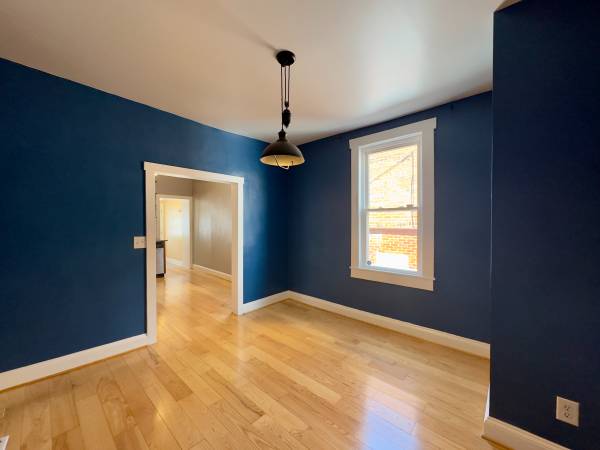 Inside, you’ll find a layout that balances style with functionality. The main living area features wood flooring, neutral tones, and generous natural light through large windows, making the space feel open and inviting. The separate dining room provides an ideal setting for meals or entertaining, with continued wood flooring and sunlight filtering through an adjacent window.