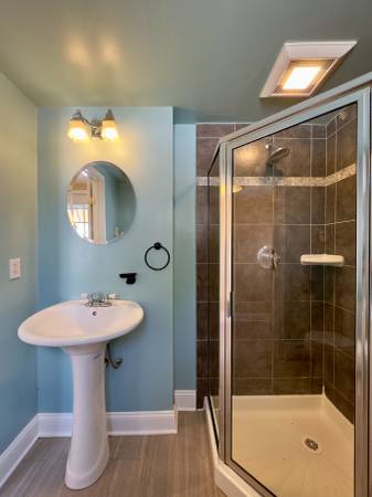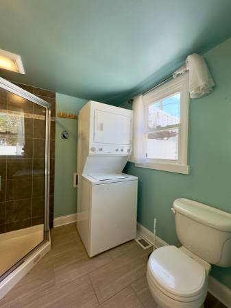 The second bedroom also features wood flooring, windows for natural light, a ceiling fan, and neutral finishes that complement various design preferences. The second bathroom includes an enclosed walk-in shower, washer and dryer, tiled flooring, a vanity mirror, and great airflow thanks to the window.