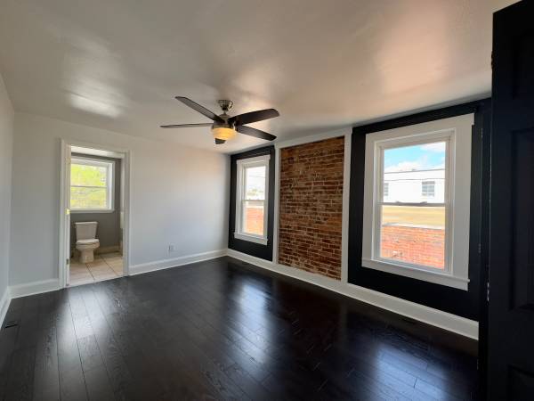 The first bedroom includes wood flooring, multiple windows, natural light, and an exposed brick headboard that adds texture and warmth. A ceiling fan enhances comfort, and the attached private bathroom is designed with tiled flooring, a wide lavatory, a cabinet, a large vanity mirror, a soaking tub, and excellent natural ventilation.