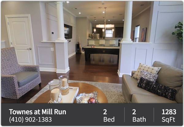 The Townes at Mill Run is a new luxury townhome community with an incredibly convenient location. Close proximity to I-795, I-695 and the Owings Mills Metro Station makes commuting and traveling into the city easy, while the community's secluded location among several sprawling parks provides a naturally beautiful and tranquil atmosphere. Nearby retail establishments provide abundant opportunities for shopping, dining and entertainment close to home. Each of our brand new townhomes offers an abundance of intelligently configured space, inviting comfort and upscale, contemporary style. Choose from a variety of two- or three-bedroom floor plans and enjoy high-end features such as integral garages, 9-foot ceilings, granite countertops and steel finish appliances. The community's extraordinary amenities include a stunning clubhouse with an entertainment kitchen, game room with billiards table, pergola for optimal outdoor celebrations, fitness center, tot lot and much more.