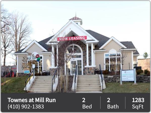 The Townes at Mill Run is a new luxury townhome community with an incredibly convenient location. Close proximity to I-795, I-695 and the Owings Mills Metro Station makes commuting and traveling into the city easy, while the community's secluded location among several sprawling parks provides a naturally beautiful and tranquil atmosphere. Nearby retail establishments provide abundant opportunities for shopping, dining and entertainment close to home. Each of our brand new townhomes offers an abundance of intelligently configured space, inviting comfort and upscale, contemporary style. Choose from a variety of two- or three-bedroom floor plans and enjoy high-end features such as integral garages, 9-foot ceilings, granite countertops and steel finish appliances. The community's extraordinary amenities include a stunning clubhouse with an entertainment kitchen, game room with billiards table, pergola for optimal outdoor celebrations, fitness center, tot lot and much more.