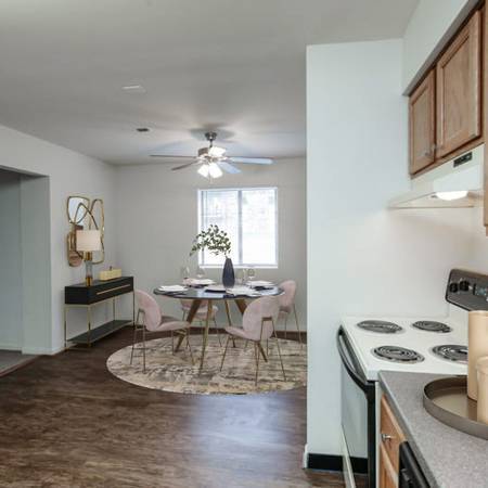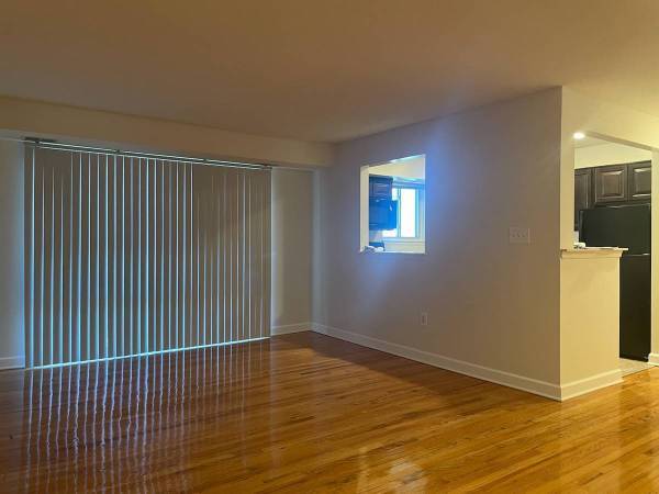 Spacious 2 bedroom apartment featuring gleaming wood floors, espresso cabinets, black energy efficient appliances with a large microwave above the stove.