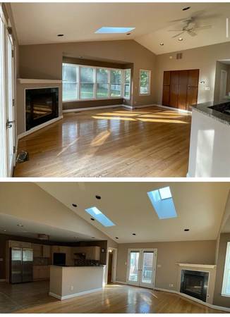 On the interior of the home, there are three bedrooms, 2 1/2 bathrooms, a formal living room, formal dining room in the front of the home. The rear of the home has a open floor plan kitchen, updated cabinets, SS refrigerator and wall oven, dishwasher, granite countertops, multi-shelved pantry, breakfast area and family room with a vaulted ceiling and skylights. Two of the bedrooms have a closet and bathroom, the third has a pass-through feature that can be closed off for privacy. There is a propane fireplace in both the family room and the formal living room. The full-size washer/dryer is located on the ground floor (not the basement) for easy access. There is no second story to the home but there is attic access via fold down ceiling staircase. The basement has a sizeable, finished area with crawl space and the unfinished portion of the basement houses the furnace, hot water heater and utility sink. The garage has storage, can accommodate two medium sized vehicles or one large with plenty of room for bicycles, etc.