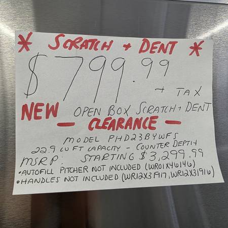 This is a BRAND NEW Open Box / Scratch & Dent product, not used. Shelves are included inside box. **Auto Fill Pitcher is not included. Door-in-door feature handles are not included (handles shown in picture come with purchase). Can be purchased separately from manufacturer.