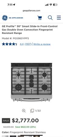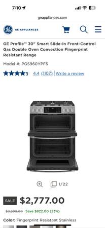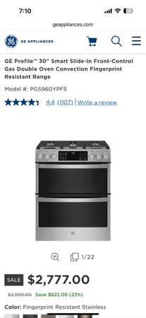 GE Profile™ 30" Smart Slide-In Front-Control Gas Double Oven Convection Fingerprint Resistant Range —brand new, in box Model #: PGS960YPFS Feel free to Google the model number for a better idea of...