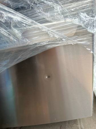 —brand new, still has plastic film from manufacturer but has a small dent on bottom right drawer (I took a photo of it)