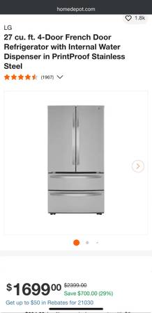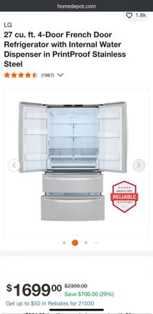 LG 27 cu. ft. 4-Door French Door Refrigerator w/ Internal Water Dispenser - $1,200 (Lutherville Timonium)