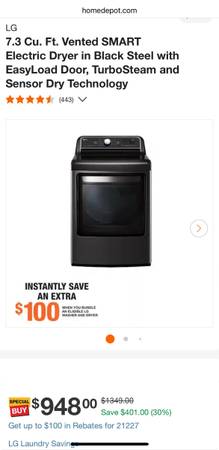 LG 7.3 Cu. Ft. Vented SMART Electric Dryer in Black Steel with EasyLoad Door, TurboSteam and Sensor Dry Technology —brand new, open box Model #: DLEX7900BE Feel free to Google the model number for a...