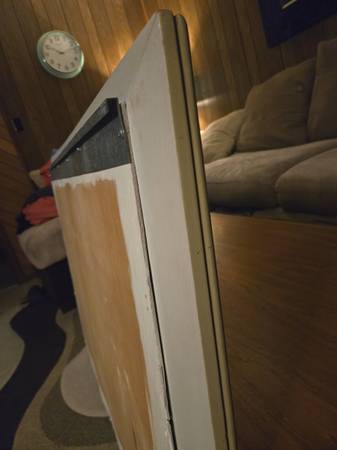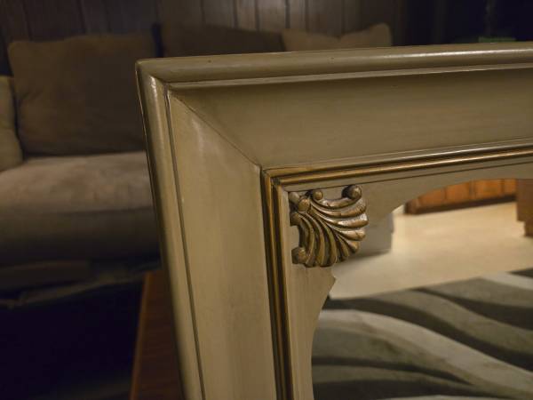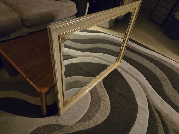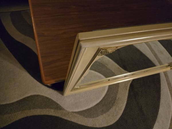 This mirror was purchased as part of a complete bedroom set in the 1950's, around 1953 to be exact, from a furniture store in downtown Baltimore, Maryland. The brand name of the mirror is Stanley Furniture. This was a well-known brand name of furniture at the time. The mirror used to hang above a double-sized bedroom dresser. The entire mirror (with frame) measures 45" wide x 33.5" high, and the frame itself is 2 1/8 inches in depth. There is gold banding around the edge of the mirror. There are also shell motifs on all four corners. There is decorative scroll, wood inlay inside the frame. There is gold on the decorative accents around the mirror. This is a heavy mirror, and because of it's weight, there is a mounting bracket on the back (see pics).
