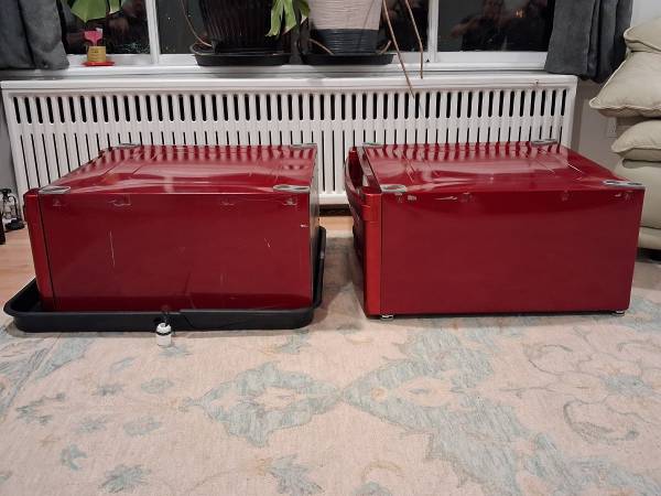 Used LG 27" Universal Pedestals Pair for washer dryer set Color: Wild Cherry Good used condition - some blemishes Looking to get $150 obo