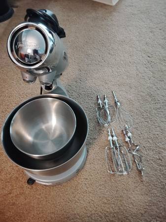 This is a Sunbeam Mixmaster Heritage Series Silver Countertop Stand Mixer #2346. The mixer comes with a large and small bowl, and seven mixer attachments. It has twelve individual speeds to ensure superior mixing control and is in great working condition. It comes with an instruction manual, and recipes. A must for the serious cook.
