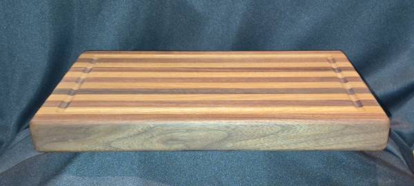 Approximately 16” length by 10” wide by 1-5/8” thick - Walnut, White Oak Laminate - Food-safe finish, food grade mineral oil, bees wax and carnauba wax. Juice channel included on each side making board easy to carry.