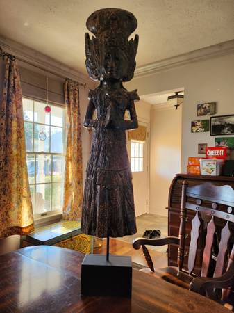 Carved African statue on square base. Not sure what the statue represents, but it is quite curious. 41 inches high, 8.5 inches wide, 3.5 inches deep.