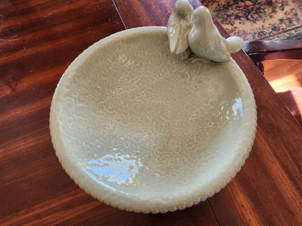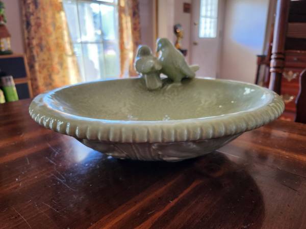 Ceramic bowl with birds (modeling a birdbath). Like new. 12 inches in diameter. 3 inches high to lip of bowl, 5.5 inches high to top of birds.