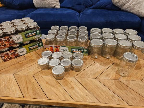 Ball Mason jars. I'm trying to get rid of the lot, for cheap. Three sizes, some have original boxes, some don't. (For those which don't, I have a big box to help carry them home).