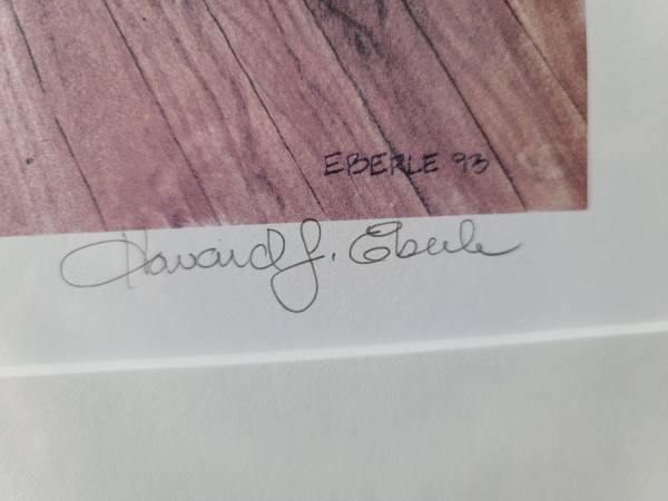 Howard J. Eberle Print. Title: "Southern Exposure." 1993. Signed and dated. Limited Edition. Per gallery, this print is sold out and no longer available from gallery. Number 52 of 250. As purchased, framed and matted. Ready to hang. One owner, seller, who bought this Oct. 3, 1993, from Mr. Eberle's shop in York, PA. Frame measures 15" X 26." Print measures 8" X 18." The print, frame, and glass are in excellent condition. The back paper has an old damp mark (dry) about 1.5" by 4" in the lower right corner. $120.00. Cash only. No returns. Please don't email. Text me at show contact info