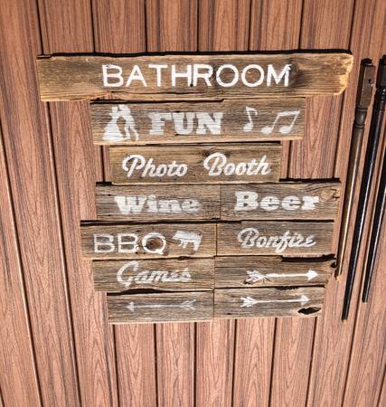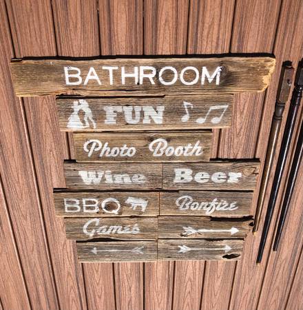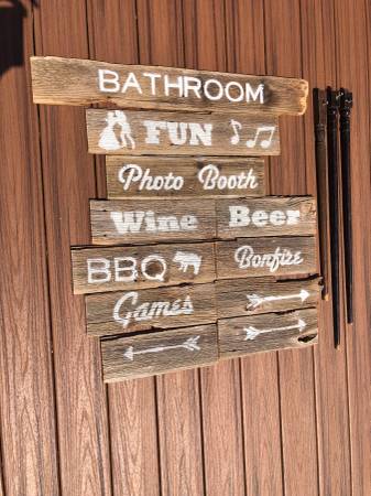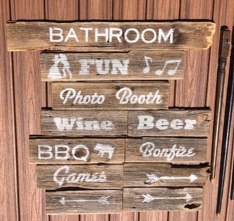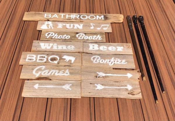 Rustic Barn wood party signs. Great for wedding receptions, BBQ, any outdoor or indoor party. Includes three antique table legs to attach signs and put in the ground. 11 individual signs: Bathroom, BBQ, Games, Fun, Photo Booth, Beer, Wine, Bonfire, 3 Arrows.