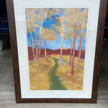 Beautiful large framed artwork that appears to be signed but unsure of artist’s name. Depicts trees and pathway shown in fall colors. Believe this to be a print that is framed with solid wood and...