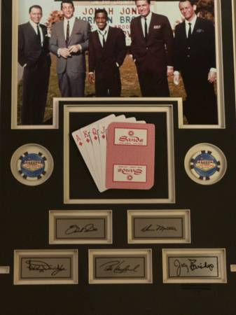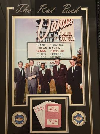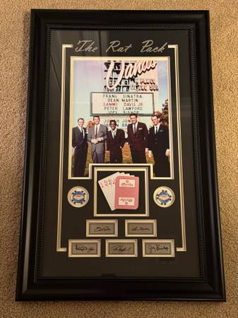 I am selling a used, "The Rat Pack" Sands Casino Las Vegas Laser Engraved Signature Framed Artwork. See the pictures for the exact item you will receive. I don't have any other boxes or paperwork, so what you see in the photos is what you will get, and nothing else. The Frame is black in color. This Artwork has Laser Engraved Signatures of: Frank Sinatra, Dean Martin, Sammy Davis Jr, Peter Lawford, and Joey Bishop. This Framed Artwork is approximately 32 inches long, 20.5 inches wide, and 1.25 inches deep. Thanks for looking.