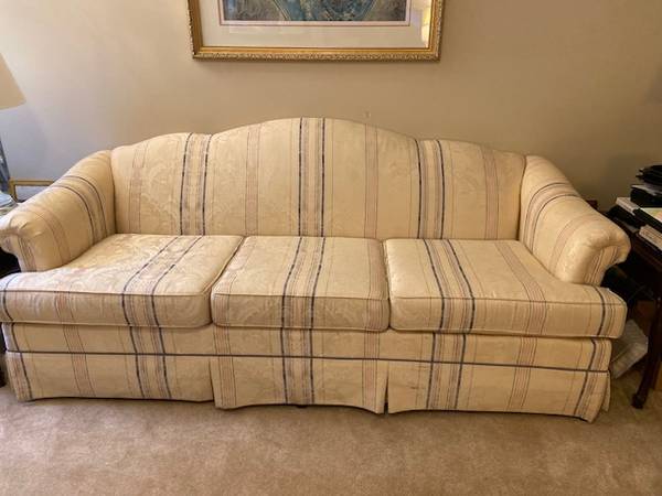 American furniture classic. Upholstered living room sofa. It comes with arms in cream color with light blue stripes.