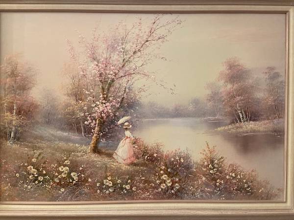 Original impressionist oil painting on canvas by Artist P. Minton. It depicts a young lady standing beside a like at Springtime.