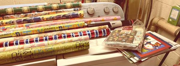 Several rolls/flat sheet’s of opened wrapping wpaper. Boxes and tissue paper.