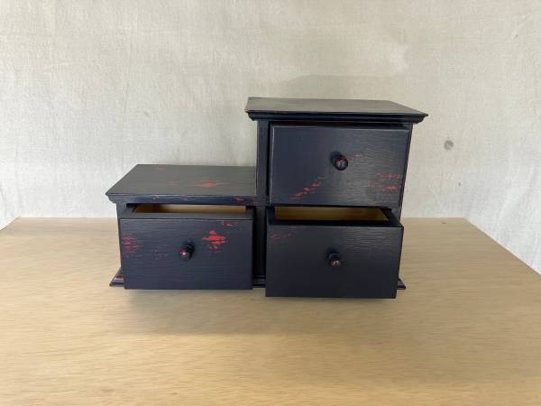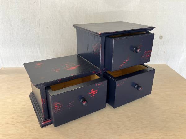 Three drawer, desktop drawer unit. Distressed, painted finish. Midnight blue over bright red. Solid wood except plywood back and drawer bottoms. Intentionally imperfect.