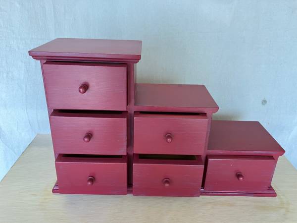 Six drawer, desktop drawer unit. Distressed, painted finish. Barn red over cornflower blue. Solid wood except plywood back and drawer bottoms. Intentionally imperfect.