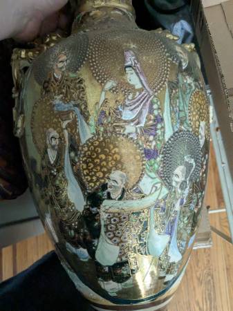 Beautiful large Japanese Satsuma-style floor vase with ornate hand-painted decoration and raised gold moriage detailing. The urn features detailed depictions of figures/immortals, dragon-style handles, and rich colors with gilded highlights.