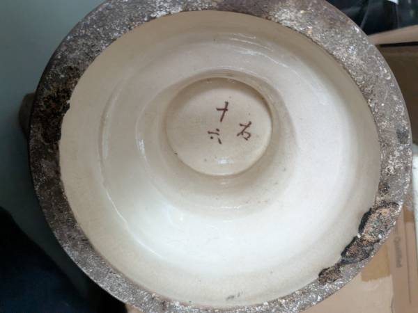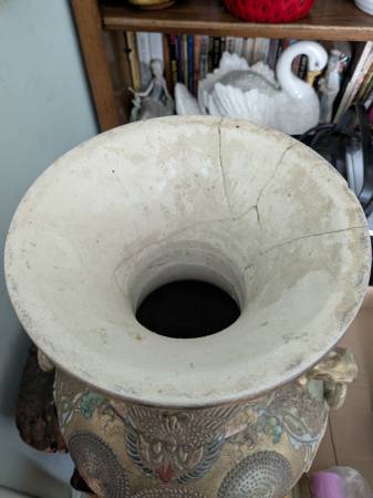 This piece has age and wear consistent with use. The top rim was broken and repaired (see photos). Still displays beautifully as a statement piece for a foyer, living room, or entryway.