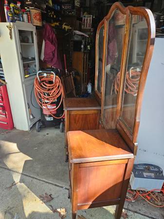 There are 6 drawers and has 8 legs that are on rollers. The chair is 17 inches wide, 16 inches in depth and has an overall height of 38 inches. The seat height is 18 inches. It is in good condition for its age. The left side piece on the mirror needs to be reattached. A little touch up is needed on the finish. $195. Please call show contact info