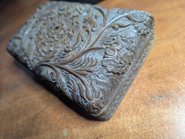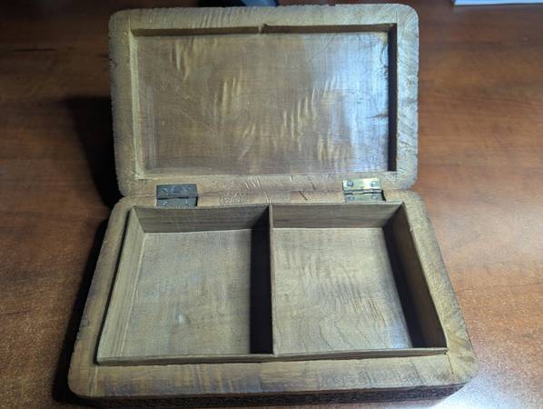 Carved Keepsake/ Box. 8" x 4-3/4" x 2-1/4". Probably teak. Probably hand carved in India. Fact is I do not know for sure. I do know it was on my Mom's dresser since the late 50s. It could stand some cleaning, especially the top. It appears grayish in the photos but I'm sure its just 60 plus years of dust. $35 obo