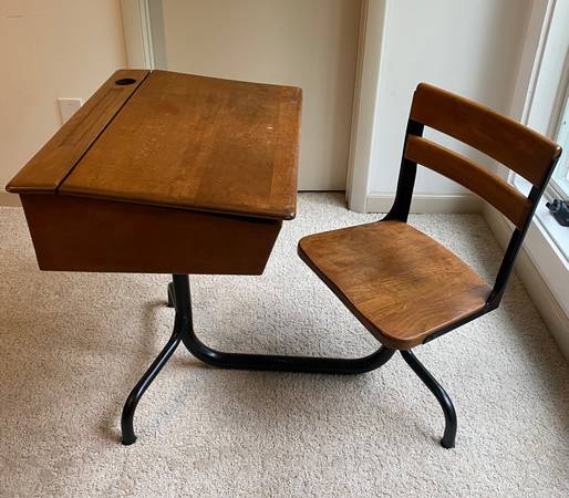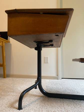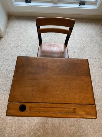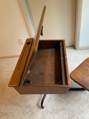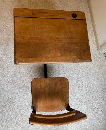 Stierhoff Bros. Antique school desk with swivel chair and lifting top. Cash, Venmo, PayPal accepted. XF009 174