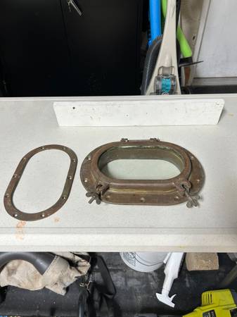 WW11 Era Brass Portholes Original Condition 5 x 9 Window 9 x 13 Overall Weight 12.2 lbs. each Original Trim Rings included Glass in good condition. Hinges full working order. $100. OR best offer
