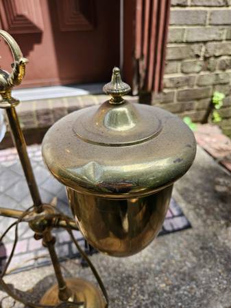 The cross member is adjustable in height. At its fullest extension, the lamp is 32 inches tall. The cross member is 20 inches wide. The total depth is 12 inches. Great lamp that works and is in good condition. There are a couple small dents as shown in the photos. $125. Please call show contact info