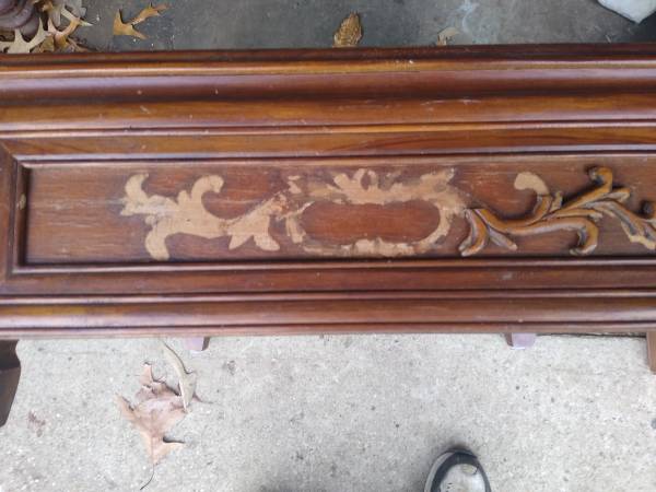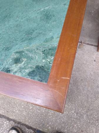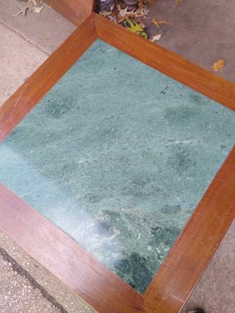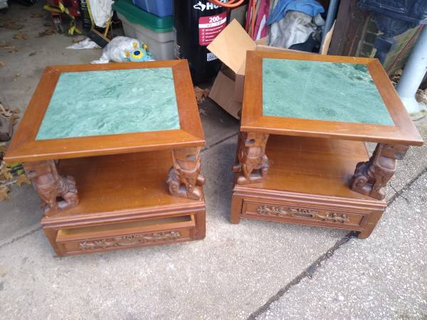 The tables are 24 inches square and stand 22 inches. They are wood with veneer. The tops are marble with wood edges. The tops are supported by 4 hard carved solid wood foo dogs. The bottom section has 1 drawer and some nice scroll work. Both tables need to be cosmetically restored. There are some veneer chips and some scroll work has come off of one side of one table. Most of the scroll pieces are in the drawer but at least 1 small piece is missing. The only comparison I could find is the exact design with a carved top instead of a marble top. The price for this table was $1600 for one. $900 for the pair. Check out all of the pictures. Please call show contact info