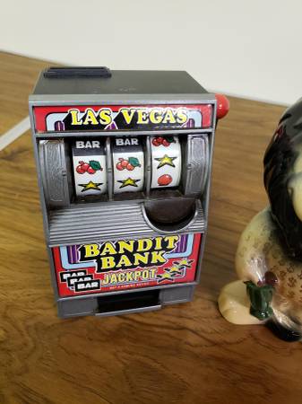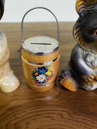 Nice assortment of coin banks All five, as pictured: 1. Slot Machine (works fine) 2. Lion 3. Wooden Barrel 4. Racoon 5. Mailbox (new with box)