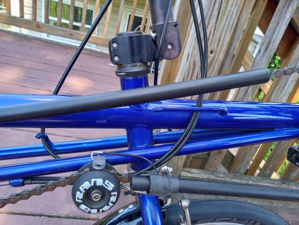 For sale is the legendary Rans Vrex recumbent bike. This is the first short wheelbase recumbent that RANS ever built. The V-Rex was a collaborative effort between three people that are now known as some of the biggest names in the recumbent industry. One was Randy Schlitter, the owner of RANS. Another player in the V-Rex triad was John Schlitter, Randy’s brother and now one of the principals at Bacchetta. The third member was Mark Colliton, recumbent designer extrodonair and currently another one of Bacchetta’s key employees. As it always has been, the current V-Rex is made from 4130 chromoly tubing (now supplied by Reynolds).