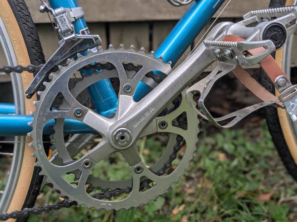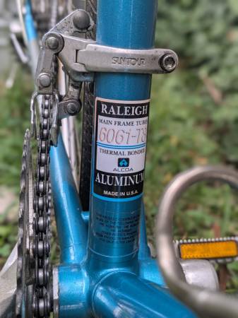 1980s Raleigh Technium 12-speed with 20-inch blue aluminum frame, made in the U.S.A. and ready to ride with new Brooks ladies leather saddle and Nitto Promenade bar, new brakes, levers, and clear cable housing, new all-terrrain tires and tire protectors, new pedals and Christophe pedal toe clips, retro steel bottle cage, and brass bell. Bike is located in the Hampden/Woodberry neighborhood of Baltimore.