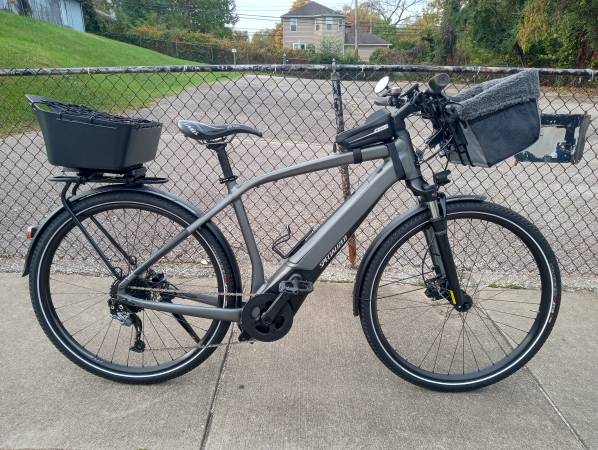 This Specialized Turbo Vado 3.0 Electric Bike is in excellent condition and very well equipped. This bike comes with the OEM battery charger. The bike has added MIK rear basket system and key lock. In front you have added K&H Pet Products Travel Dog Bike Basket. Both front and rear baskets are removeable. This bike is also equipped with integrated LED front and rear lights, heavy duty rack, kickstand, full set of fenders, bike bell, upgraded Selle SMP Extra Saddle, upgraded Chester MTB pedals, Whale Fall Waterproof Bike Frame Bag, and a bike mirror. I am asking for 1200 or best offer for the bike.