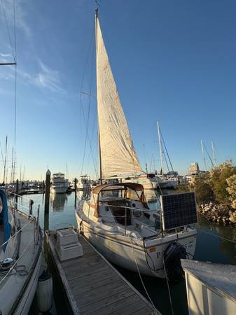 Five hank on head sails, two reef main, solar panel, composting toilet.