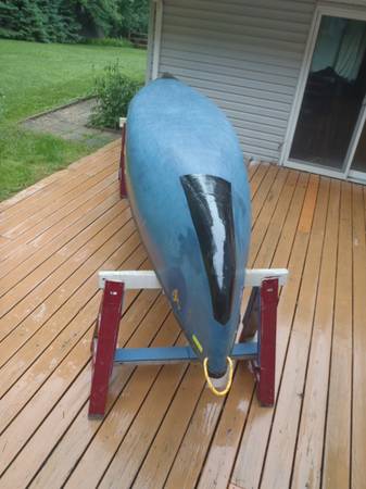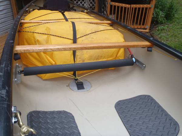 Contoured, canted stern seat with back band and foot brace, kneeling pads for tandem or bow backwards solo. D-ring pads, laced and strapped with stern float bag and large center float bag with arched belly cover. Two-later skid plates, Kevlar, Dynel and graphite powder, peel ply compressed flush.