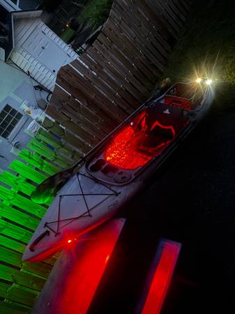 Ascend FS10 with yak power controller. Navigation bow lights and stern lights. Red led interior lights. Two available wiring spaces for whatever you add next. EVA black and white camo foam lined interior. Comes with paddle and crate, battery and charger. Everything wiring is solder sealed and heat shrunk. Fantastic kayak like new. Bought and built it as a spare. Four 4 three. 3 seven one. One 4 zero one.