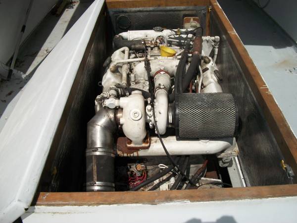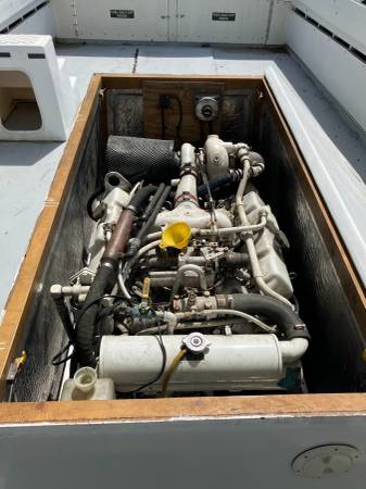 In 2004 A 8.2 Detroit Diesel 250 Hp.was installed with 2.47 to 1 Twin disc gear turning a 22x22 prop Boat cruises at 17 knots and is very good on fuel. Runs Great. The motor when installed had 155 hrs. now gauge shows 2408, So the total hours on the motor is 2563.