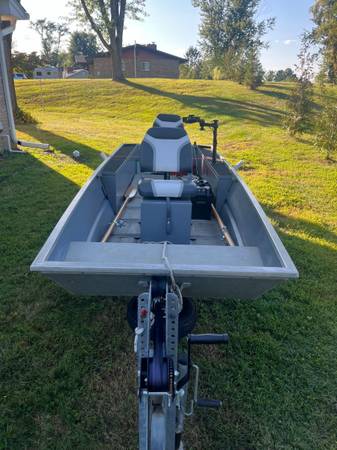 Boat comes with batteries, oars, fishfinder, anchor, ropes, boat cover and trailer. Non-skid floor.