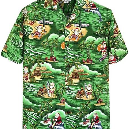 I'm selling a new with tags Aloha Republic Hawaiian shirt with Surfing Santa print in men's size XL that is constructed of 100% poplin cotton - the first $40 gets it.
