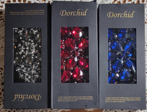 NEW set of 3 LUXURY Rhinestone stretch Belts in RED, BLUE & GUNMETAL. Brand New, still in original packaging. Paid over $89 for all 3 Material:Faux Leather and crystals /Buckle: compound metal...
