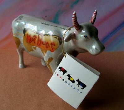Measures 6-1/4 inches long, and 4-3/4 inches tall. Marked 2000 Cow Parade Holding. The original life size figurines in fiberglass, were shown at the Chicago and New York Art Exhibit. These are...