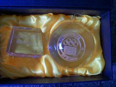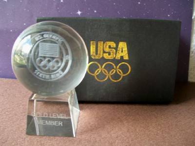 The Ball is 3 inches round, and the stand is 1-1/2 inches high. In original box, beautifully lined.